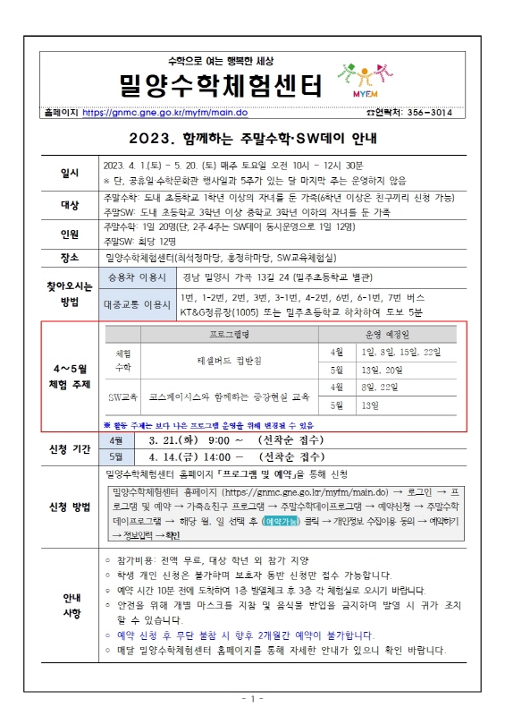 2023. 밀양수학체험센터 '함께하는 주말수학·SW데이' 운영 안내