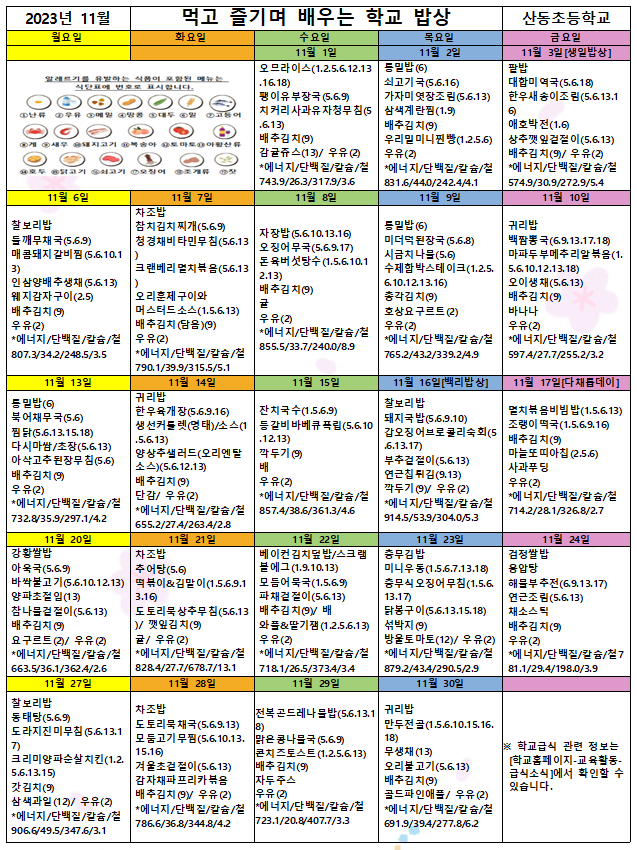 2023년 11월 학교급식 식단표 및 영양 식생활 교육 안내
