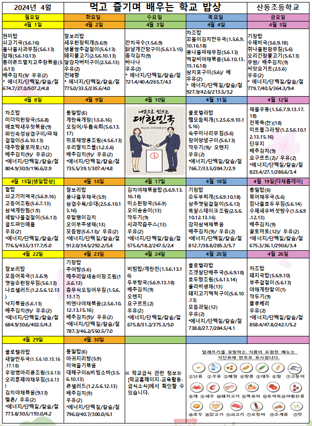 2024년 4월 학교급식 식단표 및 영양 식생활 교육 안내